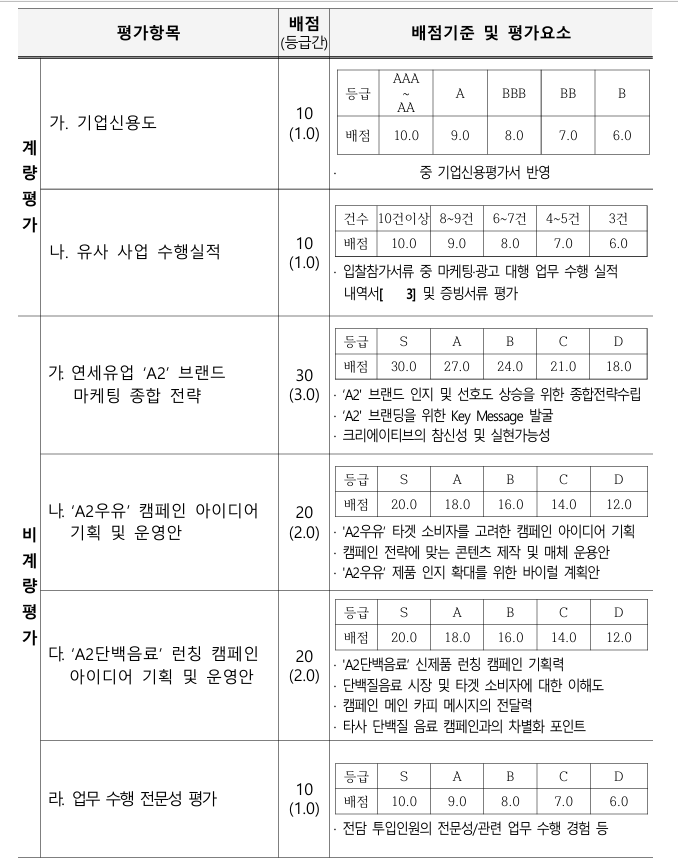 ○ 매체, 제작 등 진행 가능한 온라인 광고대행사 업체로서 2022년도, 2023년도 매출액 평균 50억 이상 증빙이 가능한 업체○ 현재, 타 캐피탈사, 중고차거래업체, 모빌리티 플랫폼 등 대행을 하고 있지 않을 것○ 공고 게시일 현재 국가기관, 지방자치단체 또는 정부 투자기관의 부적합한 업체로 제재를 받고 있지 아니한 사업자○ 업체 및 대표자가 은행연합회 불량거래처 등으로 등재되어 있지 아니한 사업자○ 단독 입찰만 가능하며 컨소시엄(공동) 입찰 불가