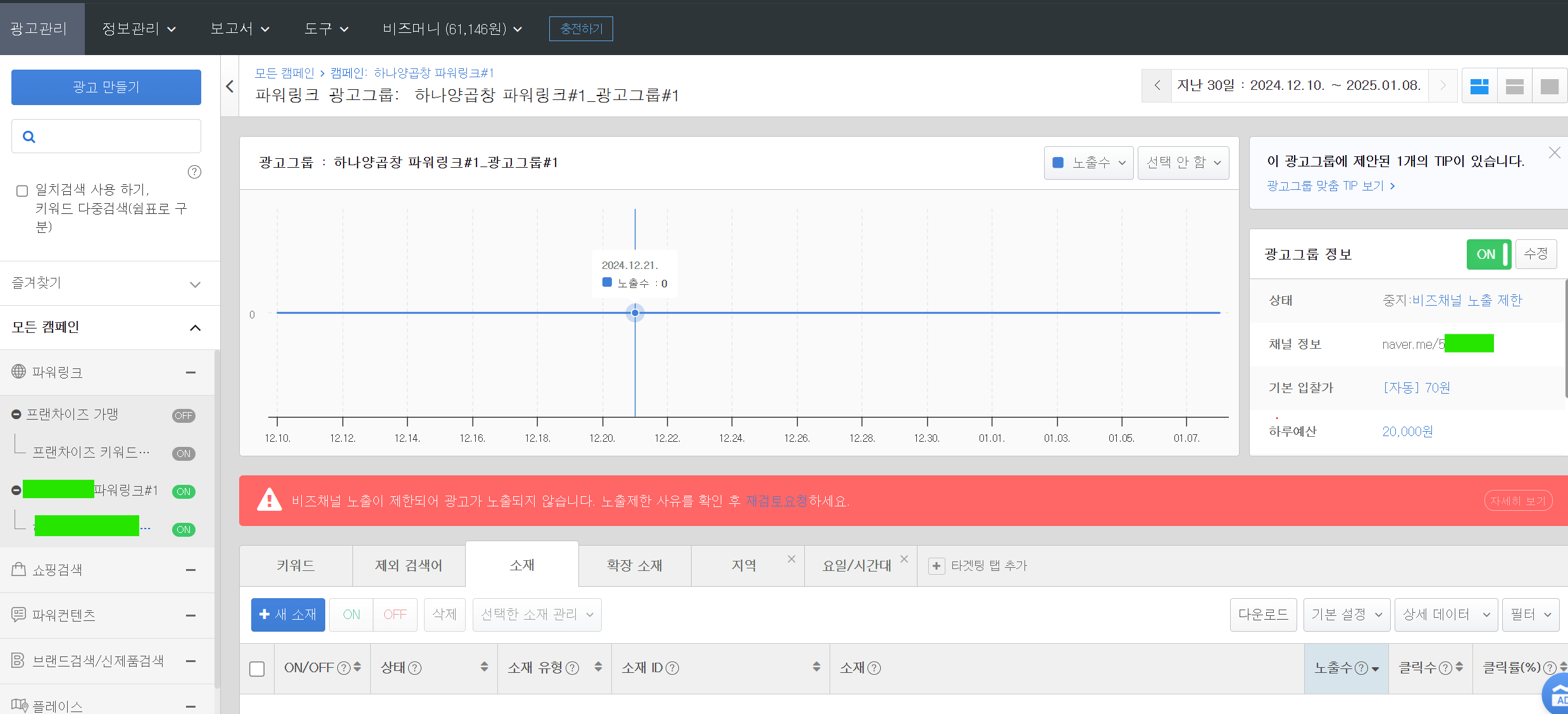 네이버 검색광고 파워링크 설정 주의할 점 [비즈노출 노출이 제한되어 광고가 노출되지 않습니다. 노출제한 사유를 확인 후 재검토요청하세요] 표시 URL과 다른 URL로 이동하는 경우가 불가능합니다 파워링크나 플레이스 검색광고 등 세팅할 때, 소재도 반드시 꼭 같이 등록해야합니다...... URL 변경이 불가능 하기 때문에 https://naver.me/513NuhL6 네이버 지도우이며녹/백합칼국수본점map.naver.com이런 단축 URL이 아니라 아래와 같이 전체 URL이 필요합니다. https://map.naver.com/p/entry/place/1935595331 네이버 지도우이며녹/백합칼국수본점map.naver.com 이렇게 숫자가 나오게끔요