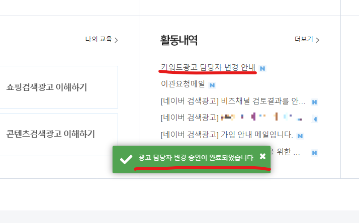검색광고에 연결된 이메일로 "담당자 변경 안내" 을 회신을 받아야 정상적으로 승인 완료된 것