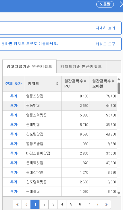 문래동동파육과 같은 키워드는 월간 검색수가 40이여서 무척 작은 것을 알 수 있음