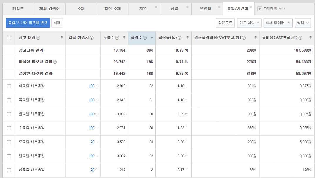 그래서 입찰 가중치를 일/월/화/수/목 > 120% 금/토 > 70% 로 설정해두면 아무래도 같은 광고비 예산으로 좀 더 효율적인 세팅이 가능하다.