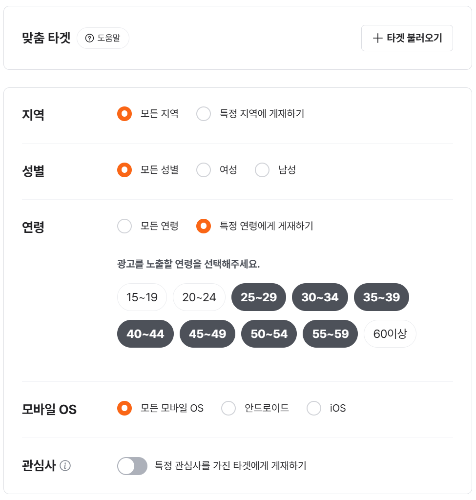 맞춤 타겟, 성별, 연령, OS 기기, 관심사 설정 등 세부 타게팅이 가능하다