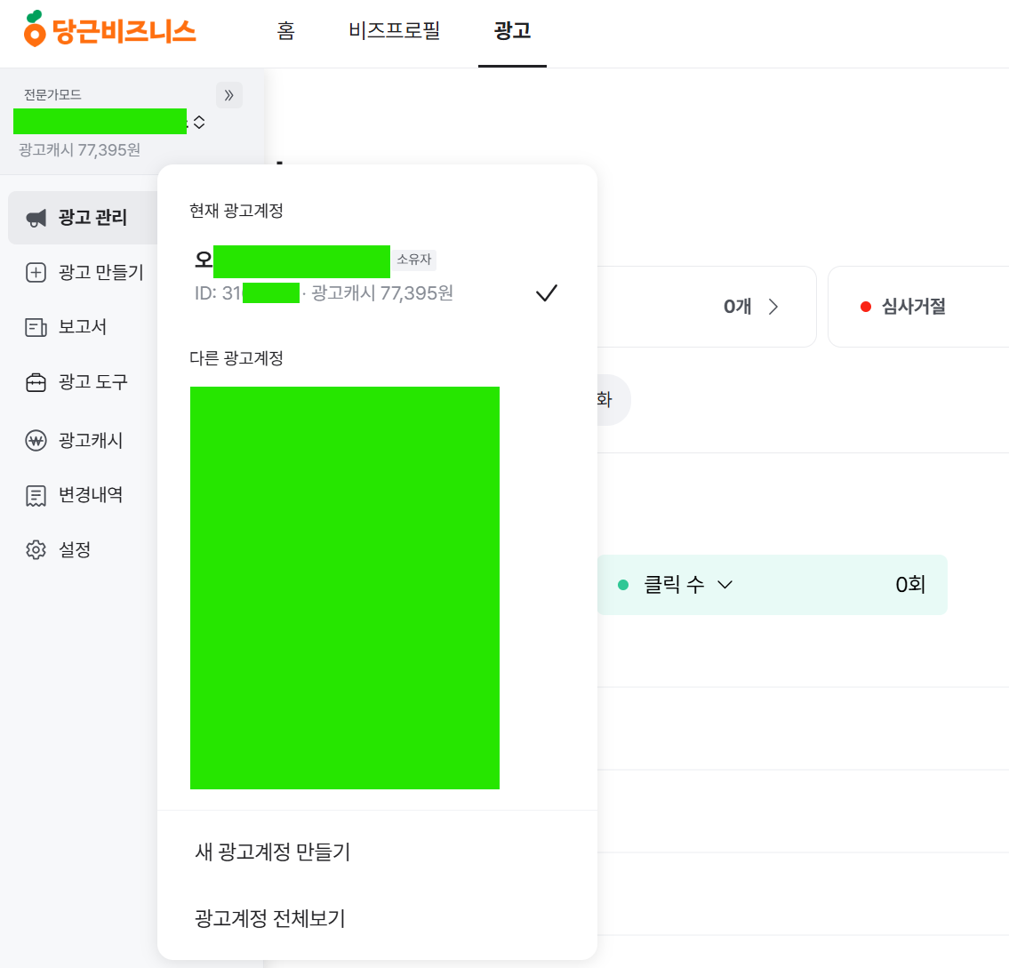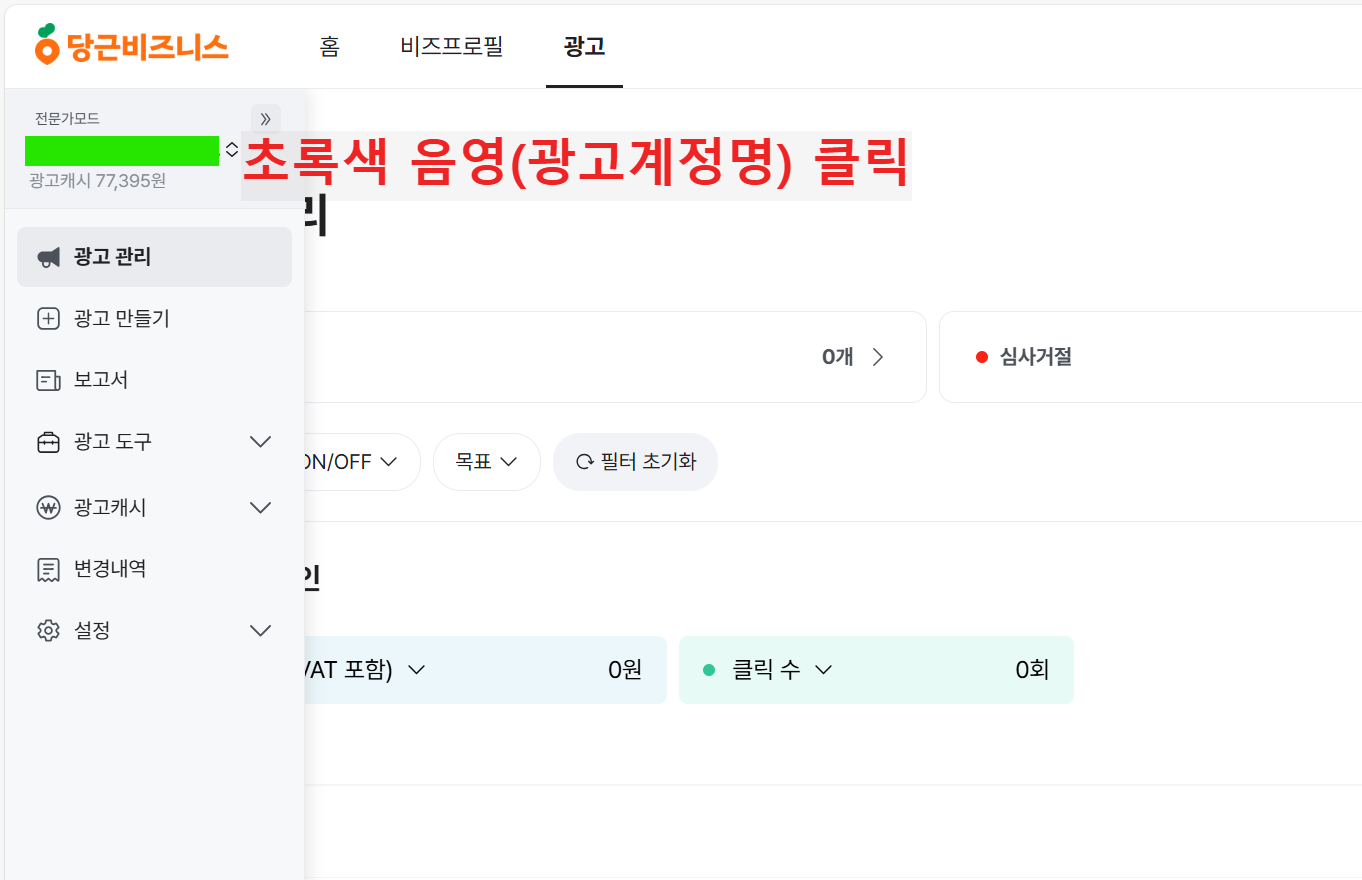 3. 왼쪽 패널(메뉴) 커서 이동 및 초록색 음영(광고계정명) 클릭