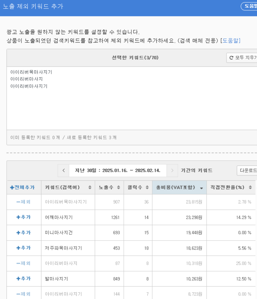 250126 - 250214 동안 아이리버목마사지기(23815원) + 아이리버마사지(10318원) + 아이리버마사지기(8723원)