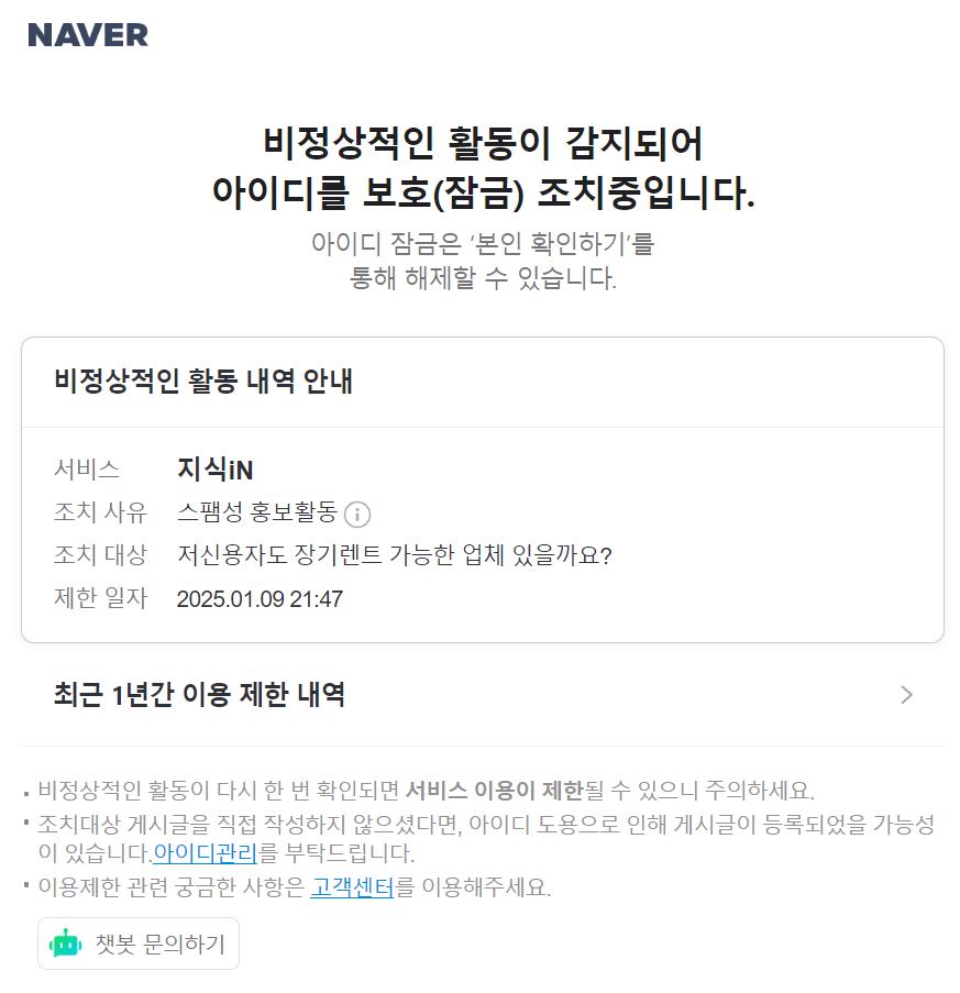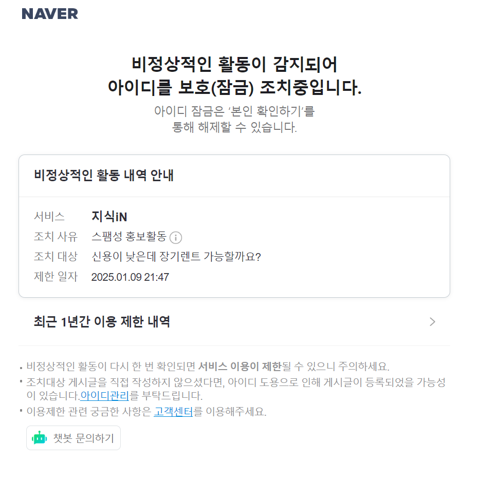 네이버 지식인 지식iN 비정상적인 활동이 감지되어 아이디를 보호(잠금) 조치중입니다. 비정상적인 활동 내역 안내