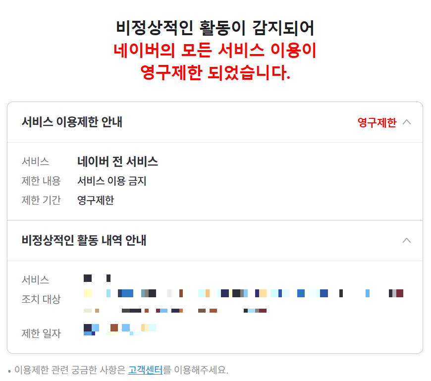 네이버 플레이스 어뷰징 영구제한 사례 (모든 서비스 이용이 영구제한 되었습니다.)