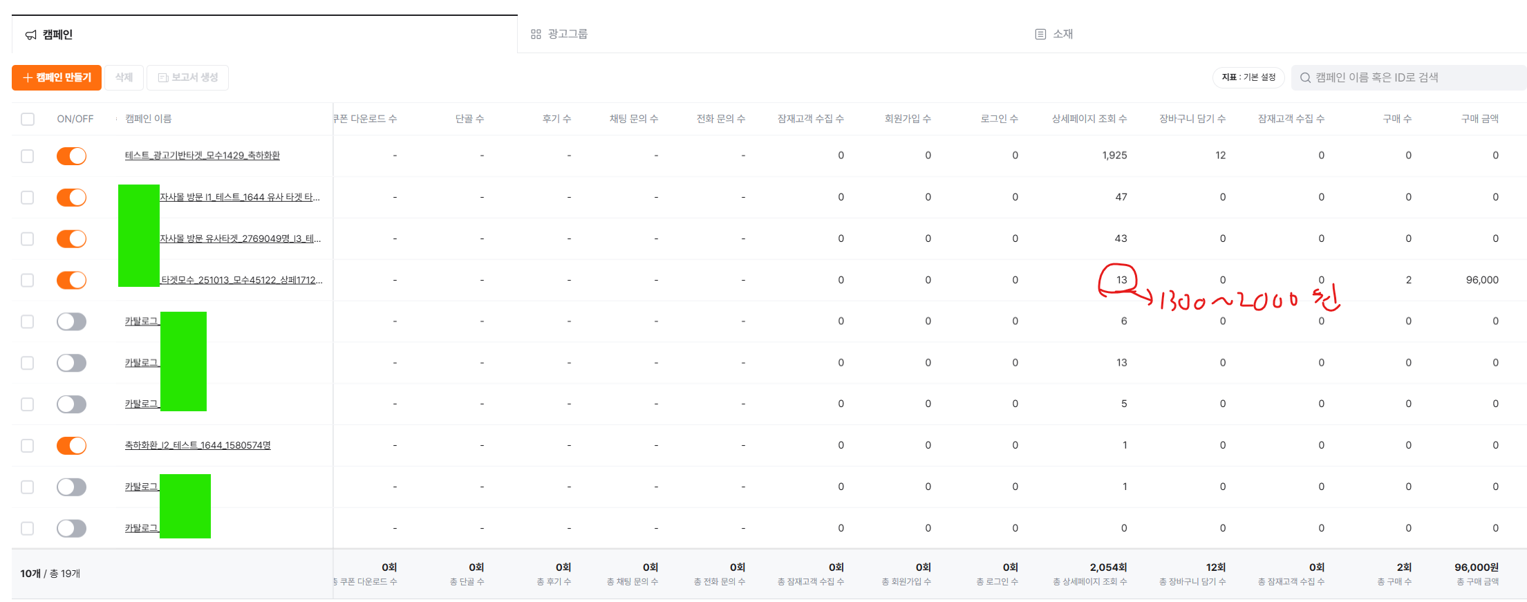 그나마 타겟모수 잡아서 작업한게 1300~2000원으로 98000원 매출 잡혀있다