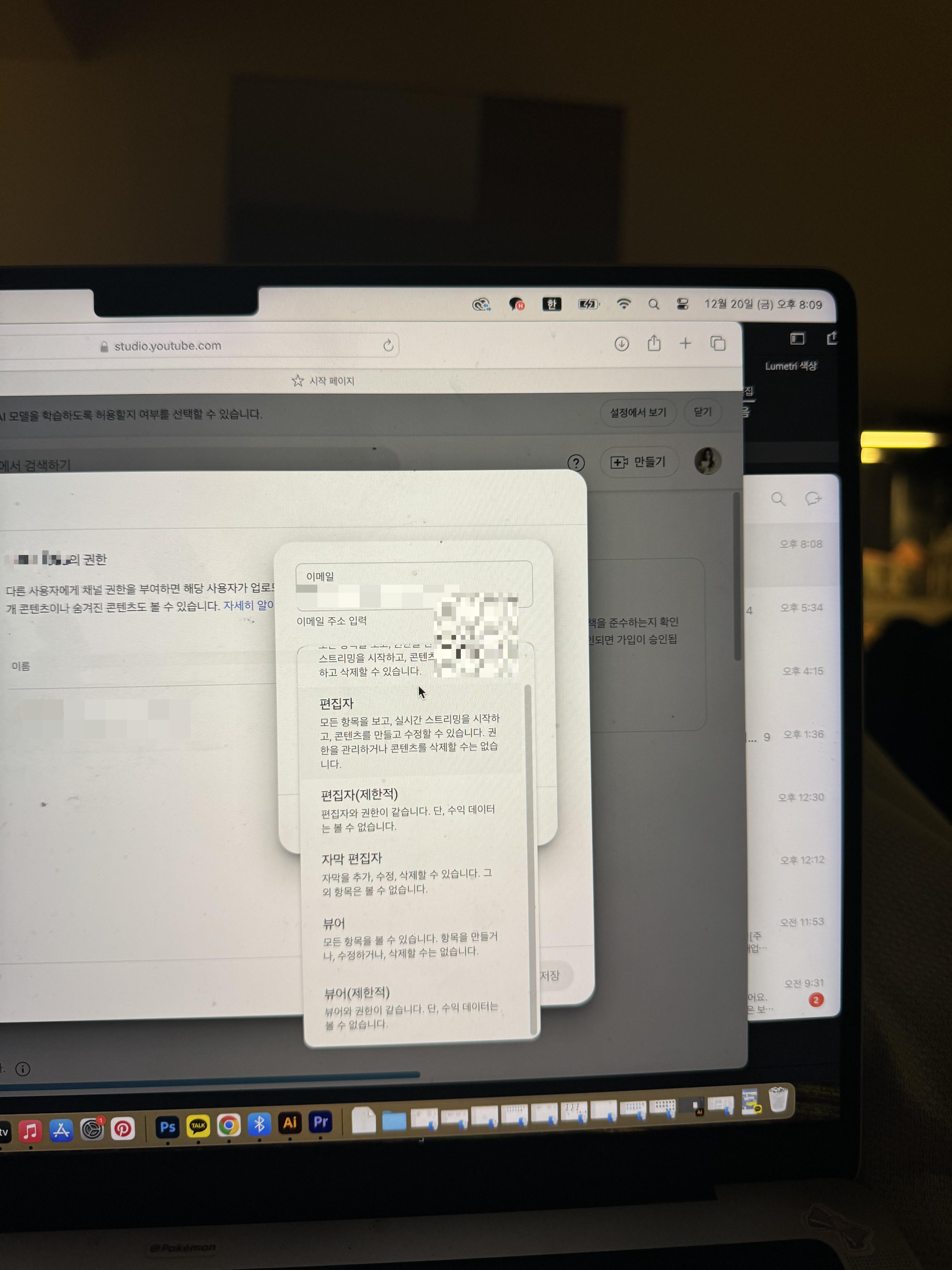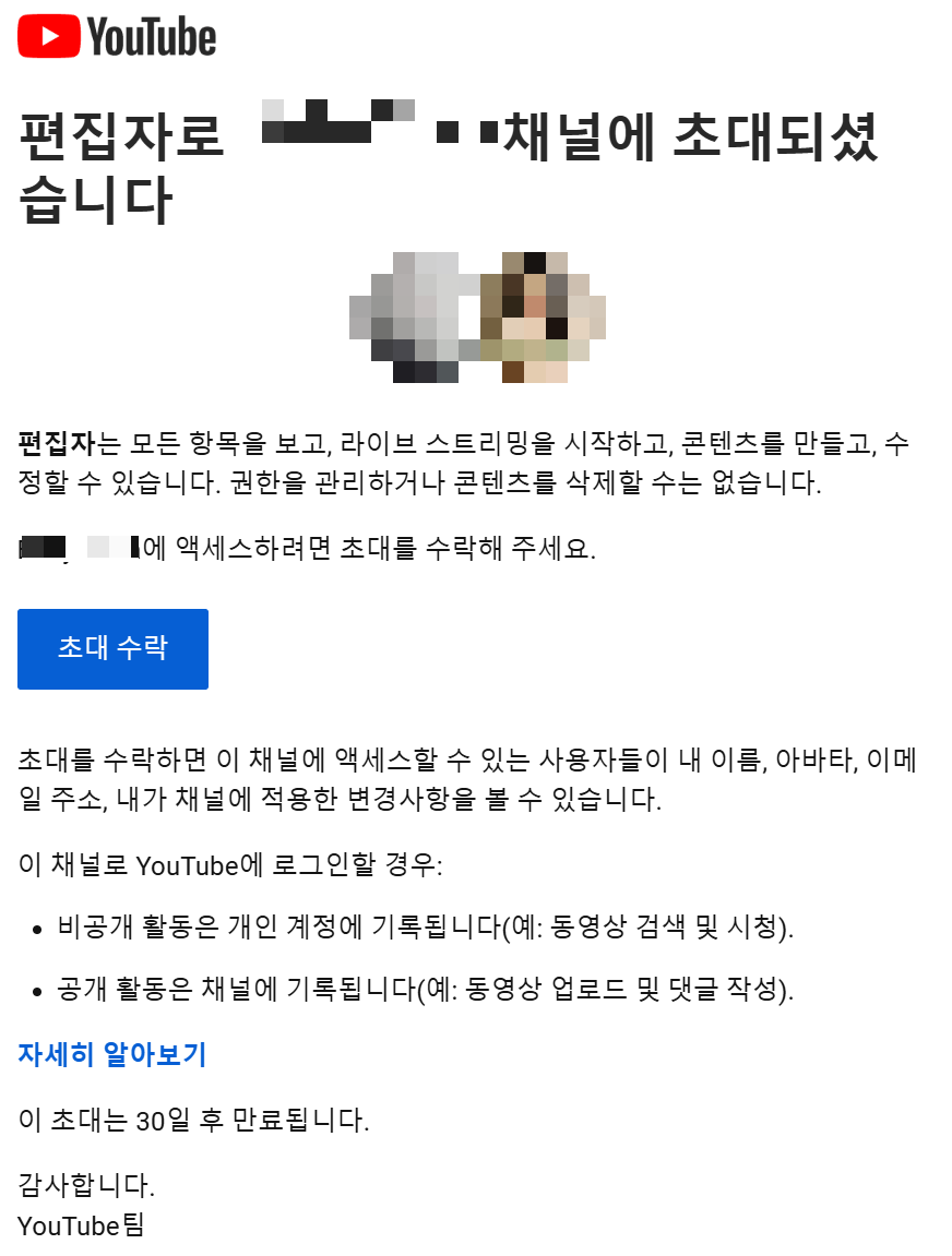 유튜브 권한 초대 / 편집자 / 자막 편집자 / 뷰어 / 관리자