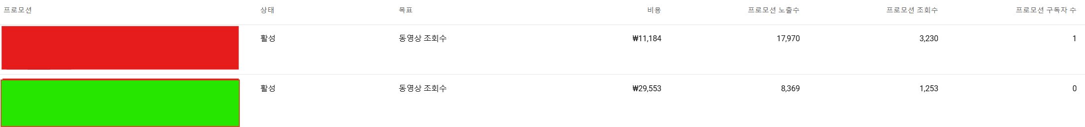 초록색 네모: 대한민국 / 29,553 비용 / 8,369 노출 / 1,253 조회 / 조회당 비용: 23.58