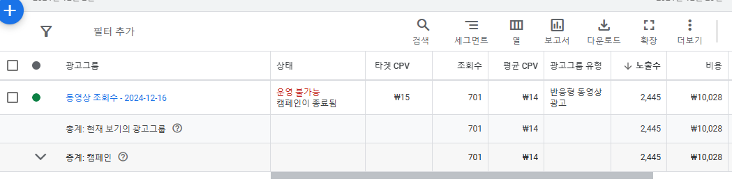 ads.google.com 가서 상세 설정 하면 타겟(목표) CPV를 15로 하면 실제 결과 CPV가 14 나옴