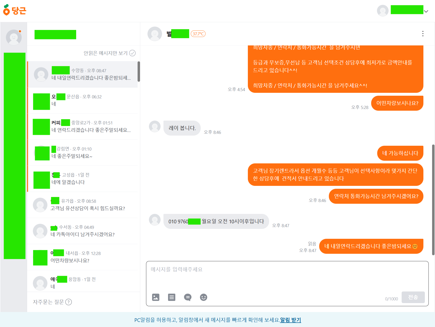 당근 전문가모드 광고 사례 [장기렌트] 현재 월 1000만원 이상 광고비 소진하는 장기렌트 광고주이다. 메타[meta](인스타그램, 페이스북) 과 네이버의 과열된 광고 시장에 염증을 느껴 다른 매체사를 찾고 있었고, 당근의 저렴한 입찰가, 관심타게팅 설정이 가능하기 때문에 당근 광고를 권유드렸다. 이렇게 고객들의 모든 대화를 관리자/팀장에 따라 권한 부여하는 방식으로 상담의 잘못된점을 쉽게 모니터링 할 수 있는 점이 장점이며 고객들의 대화를 모두 저장할 수 있다. 광고 계정을 분산시켜서 작업을 하고 있는데 그 중 1개이며 일비용을 160,000원 > 대략 월 비용 500만원 정도 집행중이며 164,164 / 992 = 165원 (cpc 평균 단가) 으로 저렴하게 광고 노출을 집행하고 있다 2..